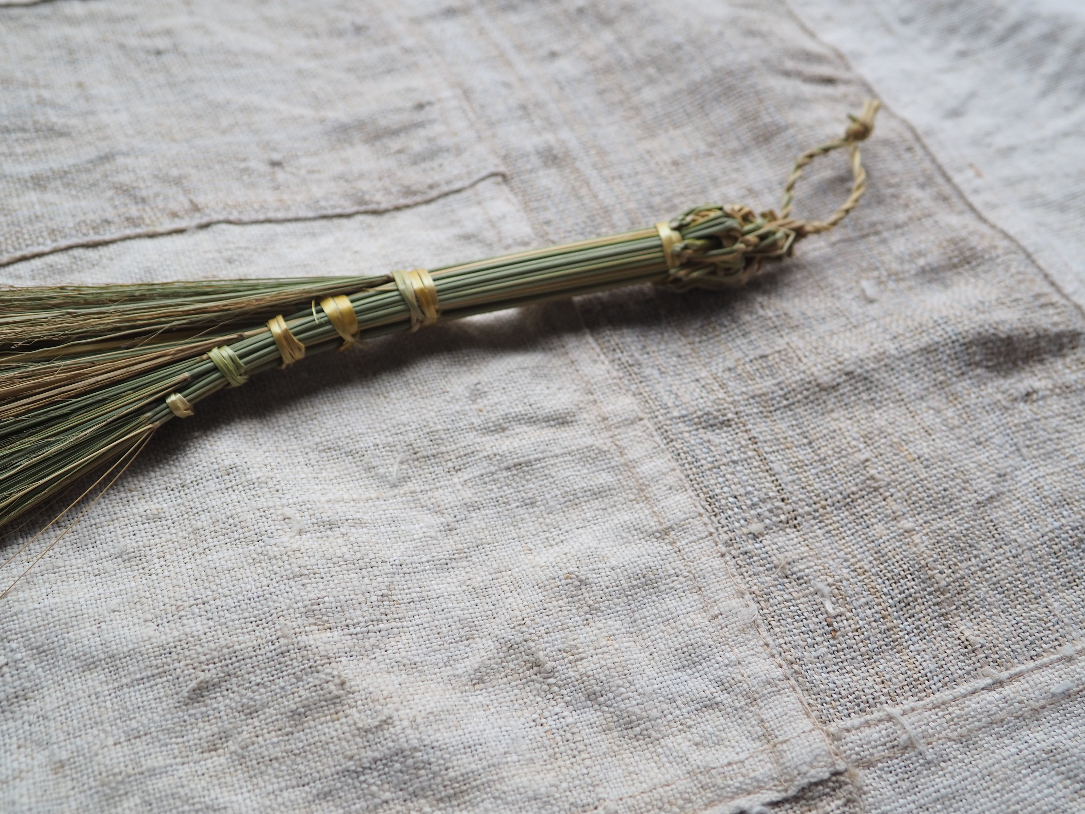 村のおばあから習った 八重山独自の編み方で留めた稲藁箒の作り方。それに 丈夫さと見た目の美しさを兼ね備えられるように少々作り方にアレンジを加え、稲藁ではなくセイバンモロコシを用いて製作した箒です。括る部分も、紐部分も、全て自然素材を使用しているため、使い終えたあとは土に還すことができます。デスクまわり、作業テーブル、食卓などで使用するのに丁度良いサイズです。